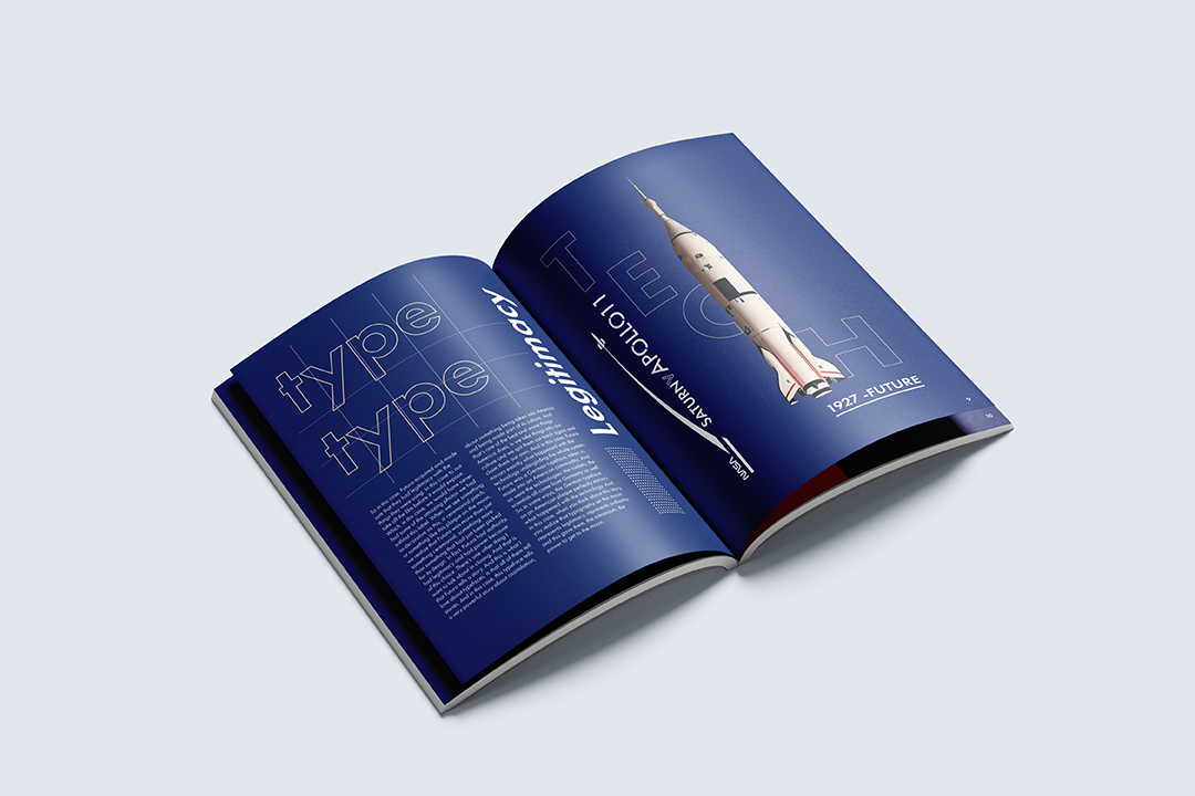 Merging aerospace and typography, a campaign was crafted that intertwines aerospace blueprint aesthetics with the unique features of the Futura font. Inspired by space exploration elements, the design boasts perfect binding to resonate with academic undertones and textured paper for tactile richness. Accentuations include an Apollo 11 Lunar Plaque-inspired bookmark and Saturn V blueprints, with packaging reminiscent of astronaut Mylar material, reinforcing the space-centric theme.